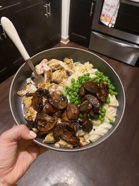 No fancy recipe here, folks. It’s a simple and effective way to get some protein, carbs, and veggies in. Just grill up a chicken breast in coconut oil and spices, throw in some mushrooms, heat some frozen peas, and add your Lean Cuisine Alfredo. Now you’ve got a healthy version of a classic that we all like to enjoy on a cold, cozy night.
